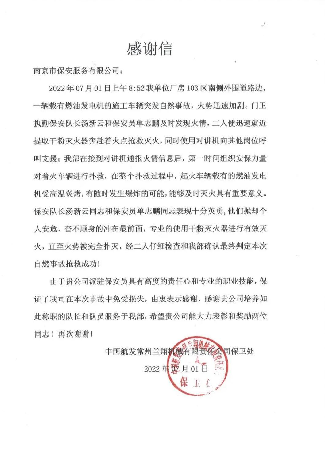 近期,南京市保安服務(wù)有限公司收到了一封來自中國航發(fā)常州蘭翔機械有限責(zé)任公司保衛(wèi)處的感謝信,信中對駐點保安員湯新云和單志鵬不顧自身安危、奮不顧身,及時處置火情保護(hù)駐點安全的行為表示衷心感謝。